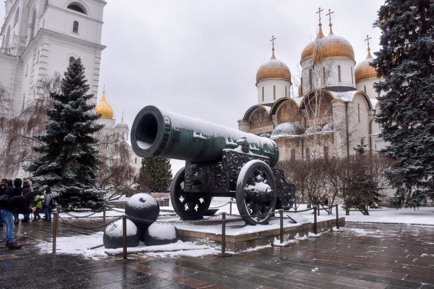 Удивила нас Царь Пушка — это 40-тонная пушка, которая была вылита в 16 веке. Бронзовый ствол калибра 890 мм, украшенный различными орнаментами и фигурами, имеет длину 5,34 метра, на правой стороне стволовой части вылито изображение царя Федора Ивановича на коне. В 185 году добавили оружейный пьедестал с колесами, четыре больших железных ядра были уложены впереди пирамидой. Конечно, пушка не была предназначена для стрельбы ядрами, её ствол был наполнен смесью свинца, железа и камней. Но пушка никогда не служил своей прямой цели.